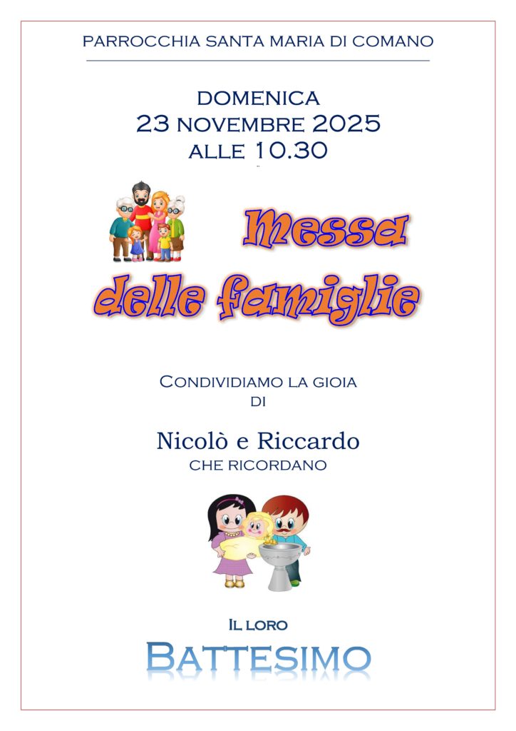 _NewsCuregliaGruppi e attività Concerto a Cureglia – 23 novembre ore 17.00 don GiustinoNov 19, 2025Nov 19, 2025 CelebrazioniFoglio settimanale S. Messe e celebrazioni: 16 – 23 novembre 2025 don GiustinoNov 14, 2025Nov 14, 2025 CelebrazioniFoglio settimanale S. Messe e celebrazioni: 9 – 16 novembre 2025 don GiustinoNov 7, 2025Nov 7, 2025 CelebrazioniFoglio settimanale S. Messe e celebrazioni: 2 – 9 novembre 2025 don GiustinoOtt 30, 2025Ott 30, 2025 CelebrazioniFoglio settimanale S. Messe e celebrazioni: 26 ottobre – 2 novembre 2025 don GiustinoOtt 27, 2025Ott 27, 2025 CelebrazioniFoglio settimanale S. Messe e celebrazioni: 19 – 26 ottobre 2025 don GiustinoOtt 18, 2025Ott 18, 2025 CelebrazioniFoglio settimanale S. Messe e celebrazioni: 12 – 19 ottobre 2025 don GiustinoOtt 6, 2025Ott 6, 2025 CelebrazioniFoglio settimanale S. Messe e celebrazioni: 5 – 12 ottobre 2025 don GiustinoOtt 2, 2025Ott 6, 2025 CelebrazioniFoglio settimanale S. Messe e celebrazioni: 28 settembre – 5 ottobre 2025 don GiustinoSet 26, 2025Set 26, 2025 123