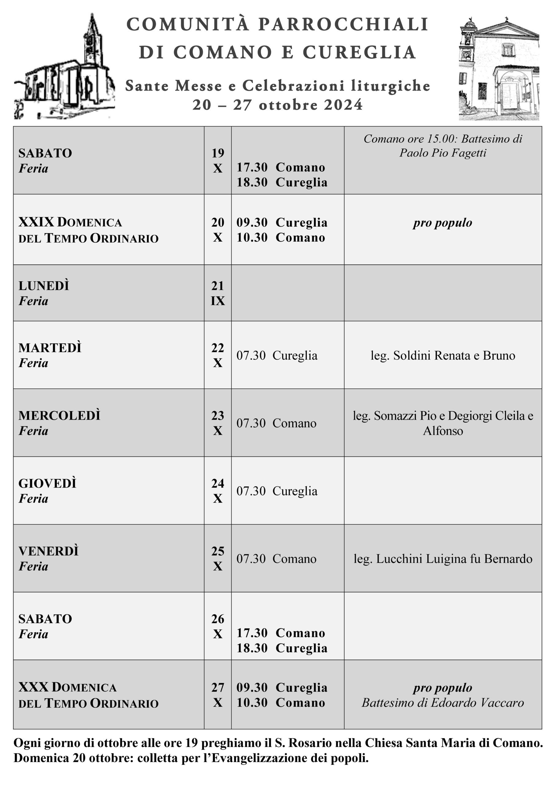 S. Messe e celebrazioni: 26 ottobre – 2 novembre 2025 don GiustinoOtt 27, 2025Ott 27, 2025 S. Messe e celebrazioni: 19 – 26 ottobre 2025 don GiustinoOtt 18, 2025Ott 18, 2025