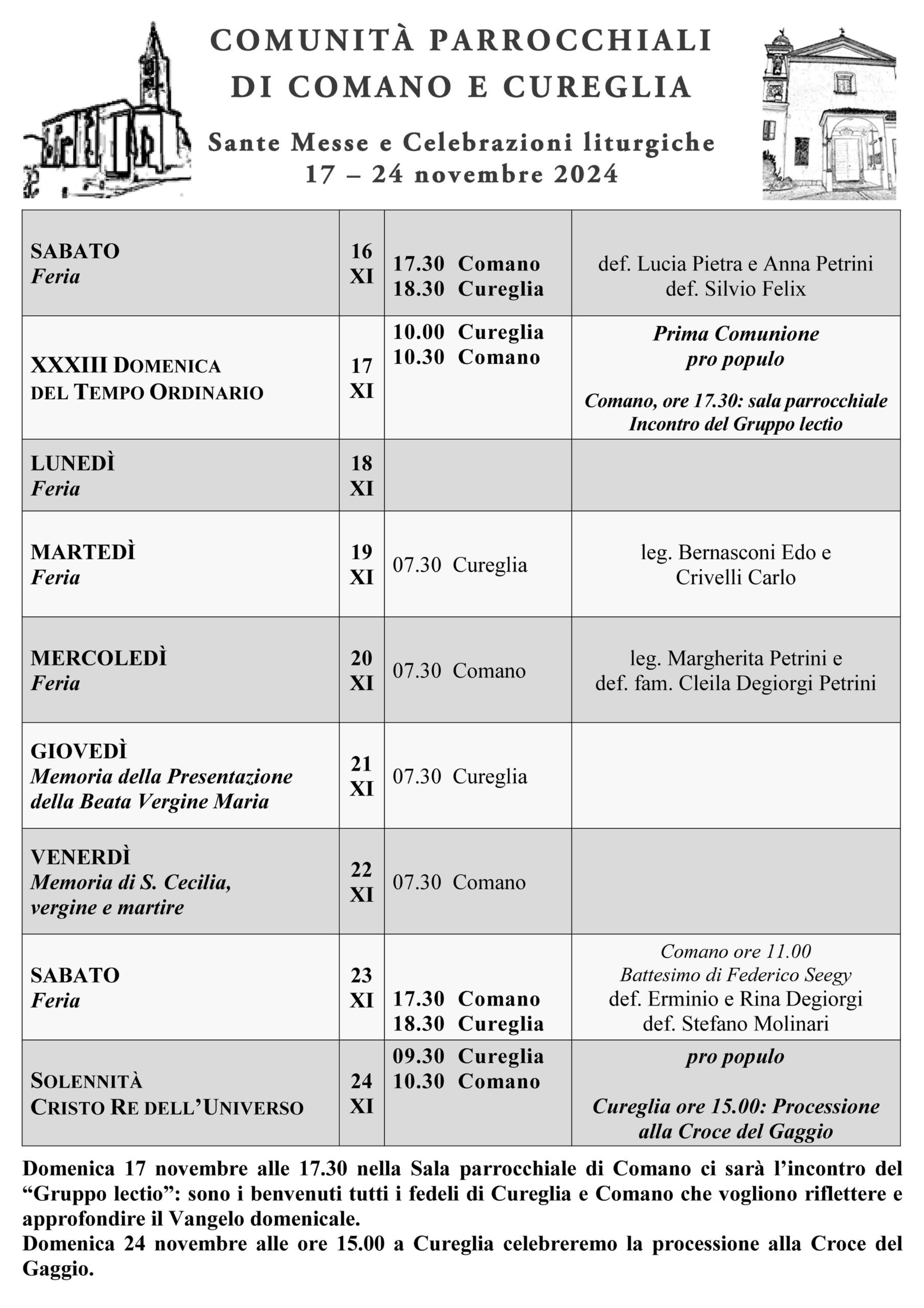S. Messe e celebrazioni: 2 – 9 novembre 2025 don GiustinoOtt 30, 2025Ott 30, 2025 S. Messe e celebrazioni: 26 ottobre – 2 novembre 2025 don GiustinoOtt 27, 2025Ott 27, 2025 S. Messe e celebrazioni: 19 – 26 ottobre 2025 don GiustinoOtt 18, 2025Ott 18, 2025