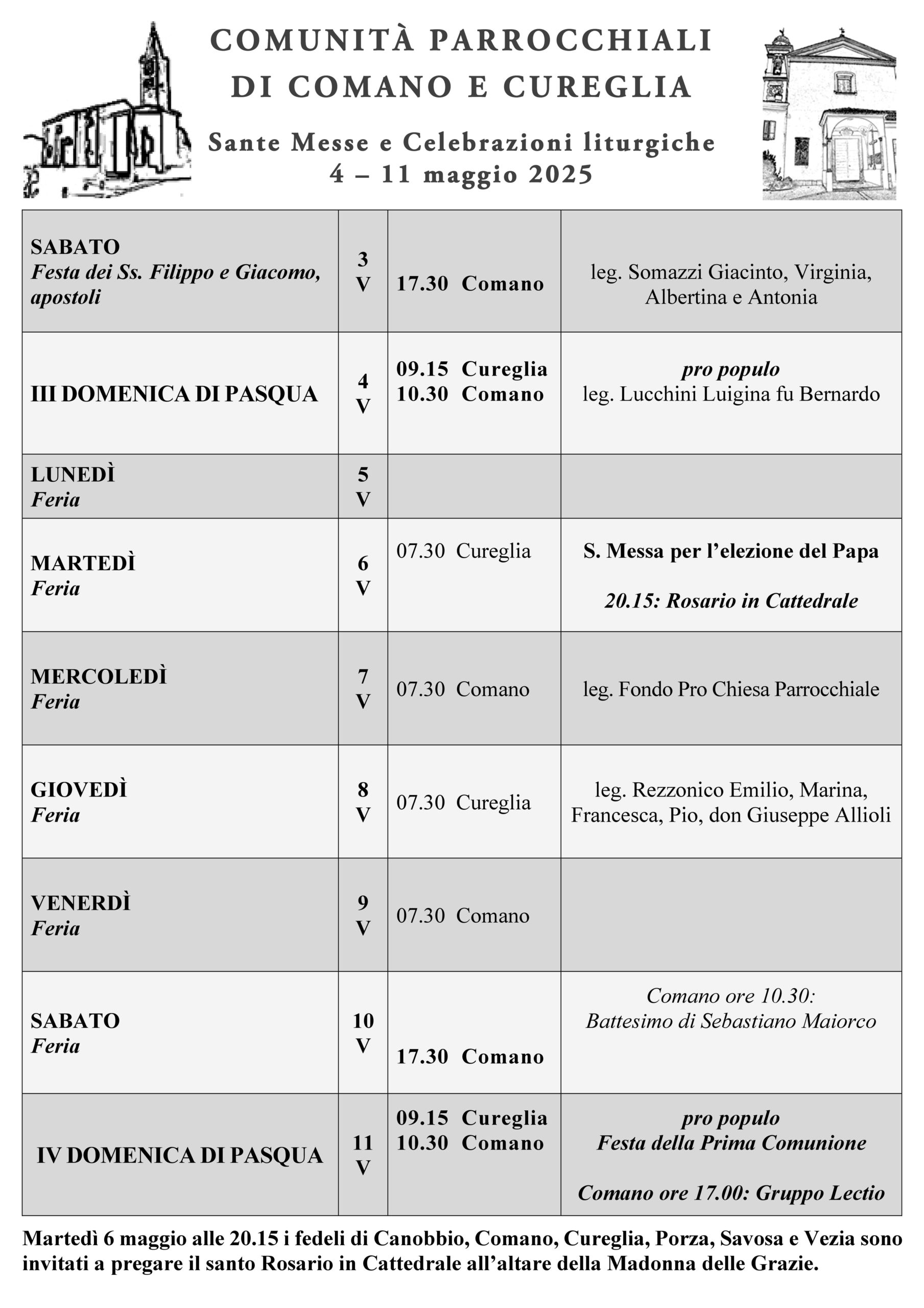 S. Messe e celebrazioni: 4 – 11 maggio 2025 don GiustinoMag 4, 2025Mag 4, 2025 <span class="nav-subtitle screen-reader-text">Page</span> Previous PostS. Messe e celebrazioni: 27 aprile – 4 maggio 2025Next PostS. Messe e celebrazioni: 11 – 18 maggio 2025 Related Posts S. Messe e celebrazioni: 2 – 9 novembre 2025 don GiustinoOtt 30, 2025Ott 30, 2025 S. Messe e celebrazioni: 26 ottobre – 2 novembre 2025 don GiustinoOtt 27, 2025Ott 27, 2025 S. Messe e celebrazioni: 19 – 26 ottobre 2025 don GiustinoOtt 18, 2025Ott 18, 2025
