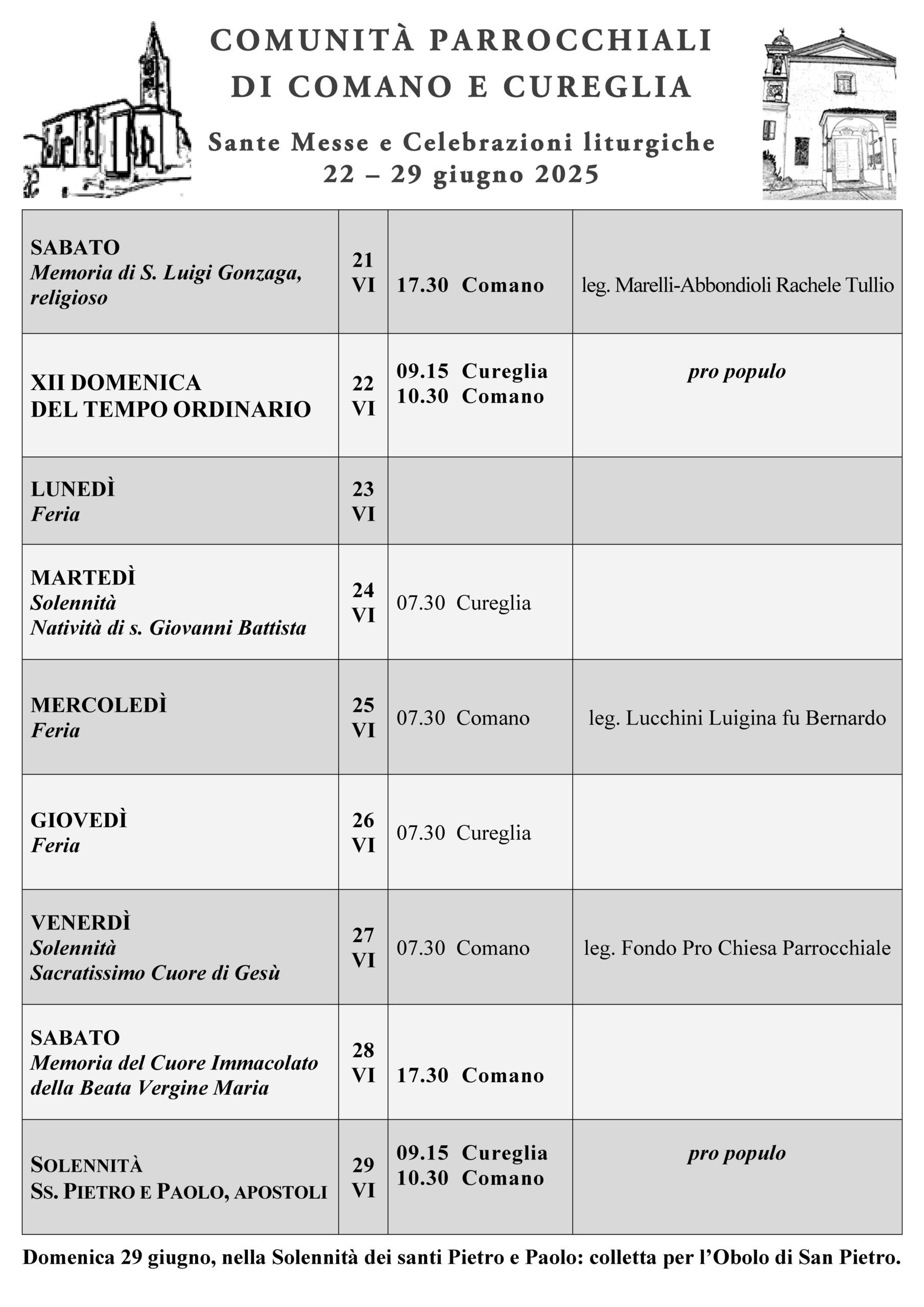 S. Messe e celebrazioni: 22 – 29 giugno 2025
