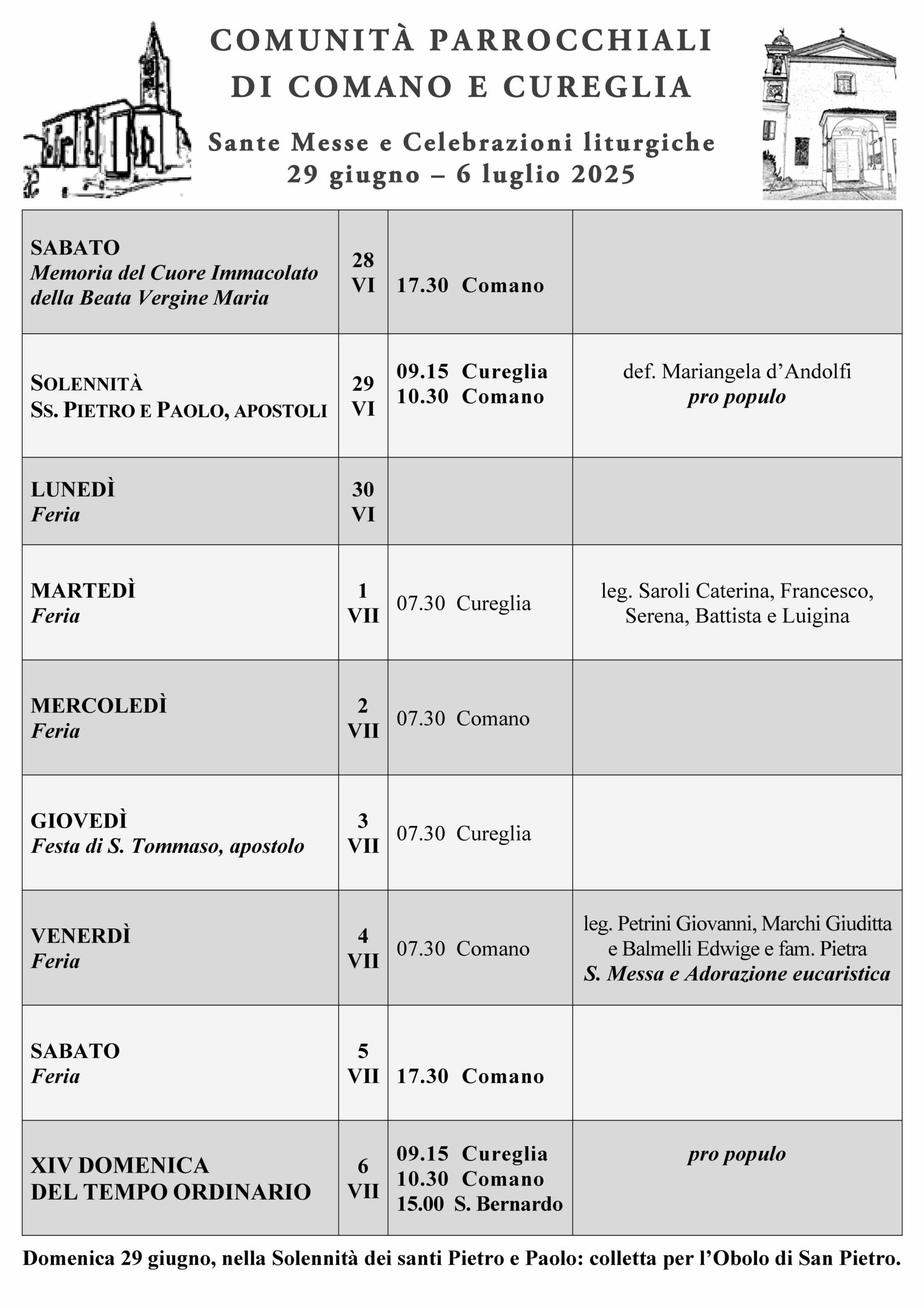 S. Messe e celebrazioni: 29 giugno – 6 luglio 2025 don GiustinoGiu 27, 2025Giu 28, 2025 <span class="nav-subtitle screen-reader-text">Page</span> Previous PostS. Messe e celebrazioni: 22 – 29 giugno 2025Next PostS. Messe e celebrazioni: 6 – 13 luglio 2025 Related Posts S. Messe e celebrazioni: 2 – 9 novembre 2025 don GiustinoOtt 30, 2025Ott 30, 2025 S. Messe e celebrazioni: 26 ottobre – 2 novembre 2025 don GiustinoOtt 27, 2025Ott 27, 2025 S. Messe e celebrazioni: 19 – 26 ottobre 2025 don GiustinoOtt 18, 2025Ott 18, 2025