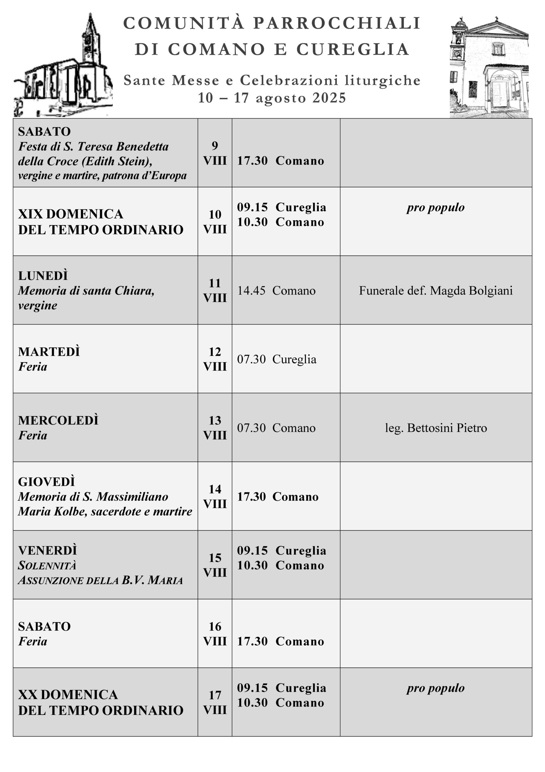 S. Messe e celebrazioni: 26 ottobre – 2 novembre 2025 don GiustinoOtt 27, 2025Ott 27, 2025 S. Messe e celebrazioni: 19 – 26 ottobre 2025 don GiustinoOtt 18, 2025Ott 18, 2025