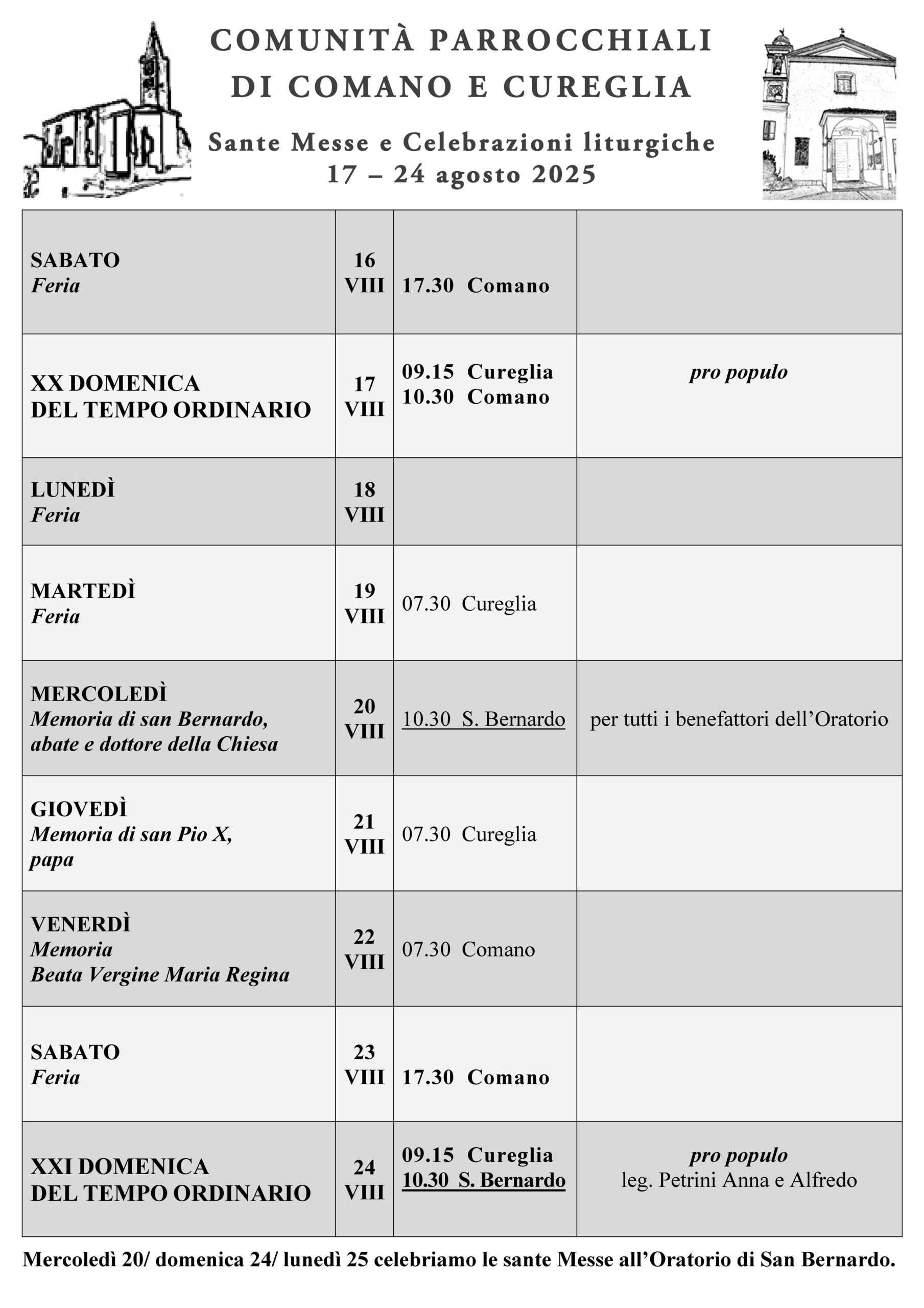 S. Messe e celebrazioni: 17 – 24 agosto 2025
