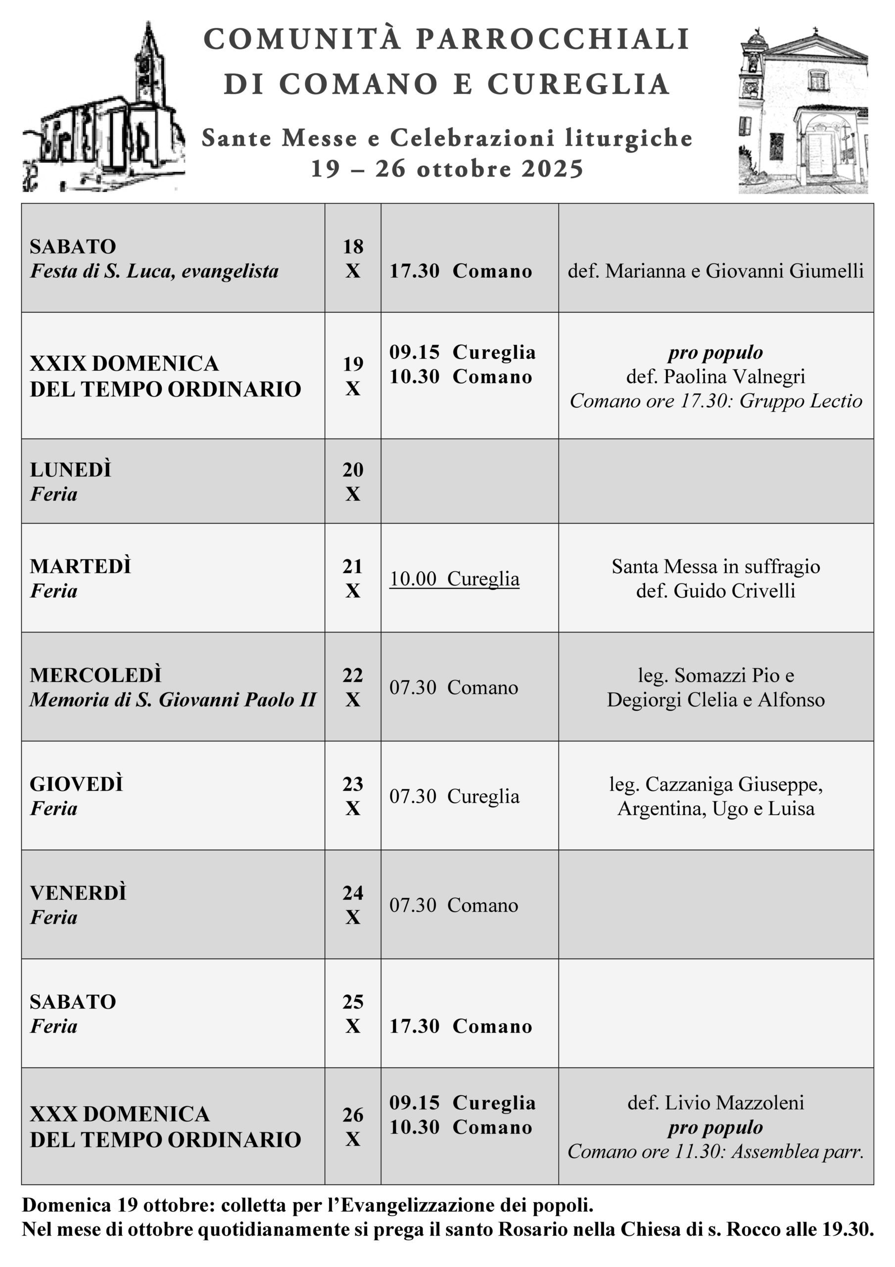 S. Messe e celebrazioni: 16 – 23 novembre 2025 don GiustinoNov 14, 2025Nov 14, 2025 S. Messe e celebrazioni: 9 – 16 novembre 2025 don GiustinoNov 7, 2025Nov 7, 2025 S. Messe e celebrazioni: 2 – 9 novembre 2025 don GiustinoOtt 30, 2025Ott 30, 2025
