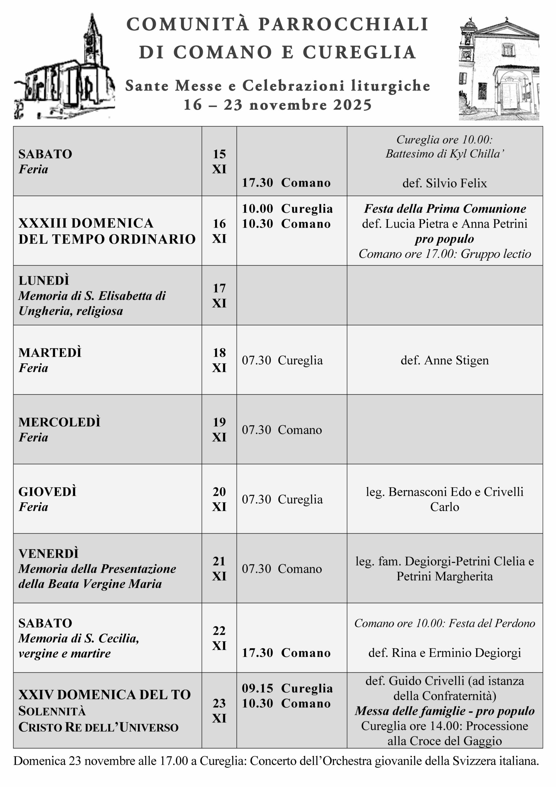 S. Messe e celebrazioni: 16 – 23 novembre 2025 don GiustinoNov 14, 2025Nov 14, 2025 <span class="nav-subtitle screen-reader-text">Page</span> Previous PostS. Messe e celebrazioni: 9 – 16 novembre 2025Next PostConcerto a Cureglia – 23 novembre ore 17.00 Related Posts S. Messe e celebrazioni: 23 – 30 novembre 2025 don GiustinoNov 22, 2025Nov 22, 2025 S. Messe e celebrazioni: 9 – 16 novembre 2025 don GiustinoNov 7, 2025Nov 7, 2025 S. Messe e celebrazioni: 2 – 9 novembre 2025 don GiustinoOtt 30, 2025Ott 30, 2025