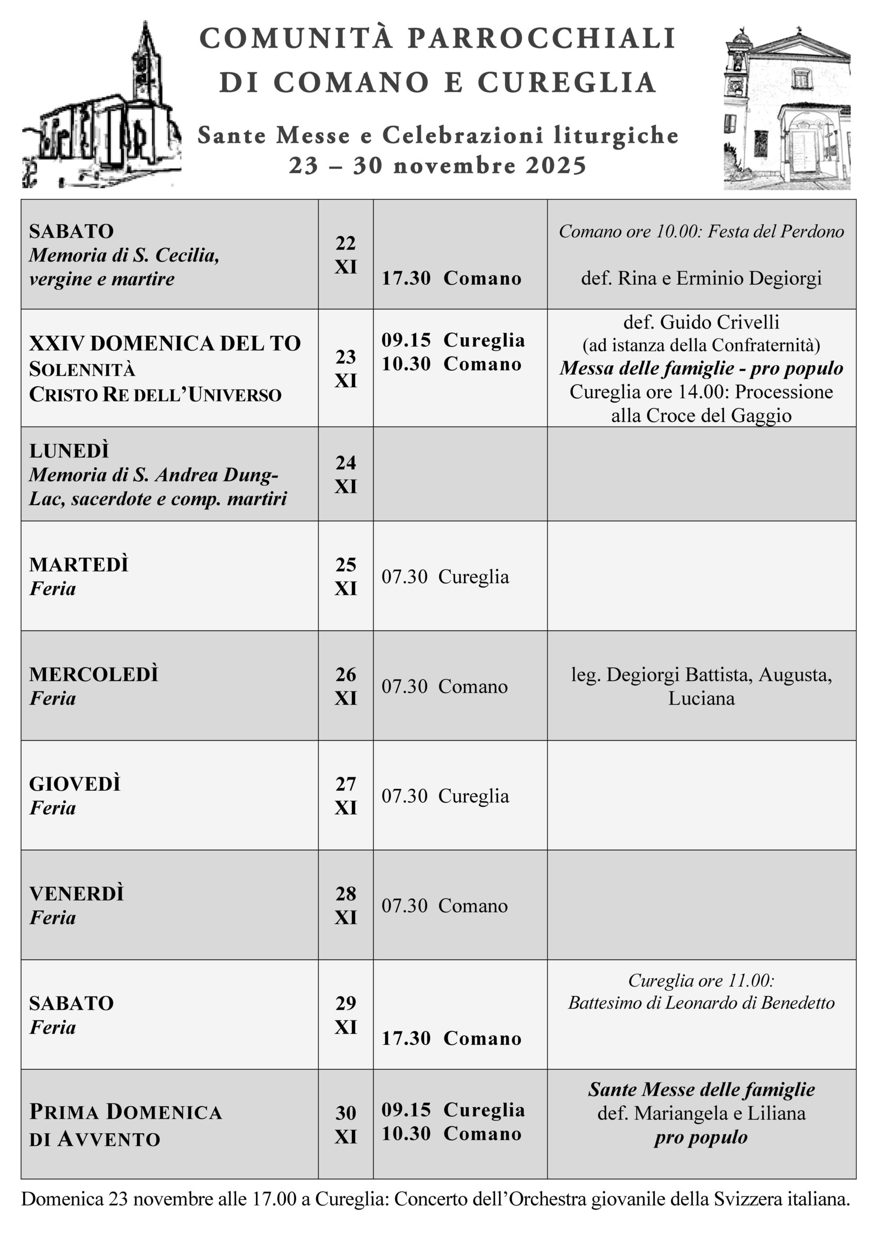 S. Messe e celebrazioni: 23 – 30 novembre 2025 don GiustinoNov 22, 2025Nov 22, 2025 <span class="nav-subtitle screen-reader-text">Page</span> Previous PostConcerto a Cureglia – 23 novembre ore 17.00 Related Posts S. Messe e celebrazioni: 16 – 23 novembre 2025 don GiustinoNov 14, 2025Nov 14, 2025 S. Messe e celebrazioni: 9 – 16 novembre 2025 don GiustinoNov 7, 2025Nov 7, 2025 S. Messe e celebrazioni: 2 – 9 novembre 2025 don GiustinoOtt 30, 2025Ott 30, 2025