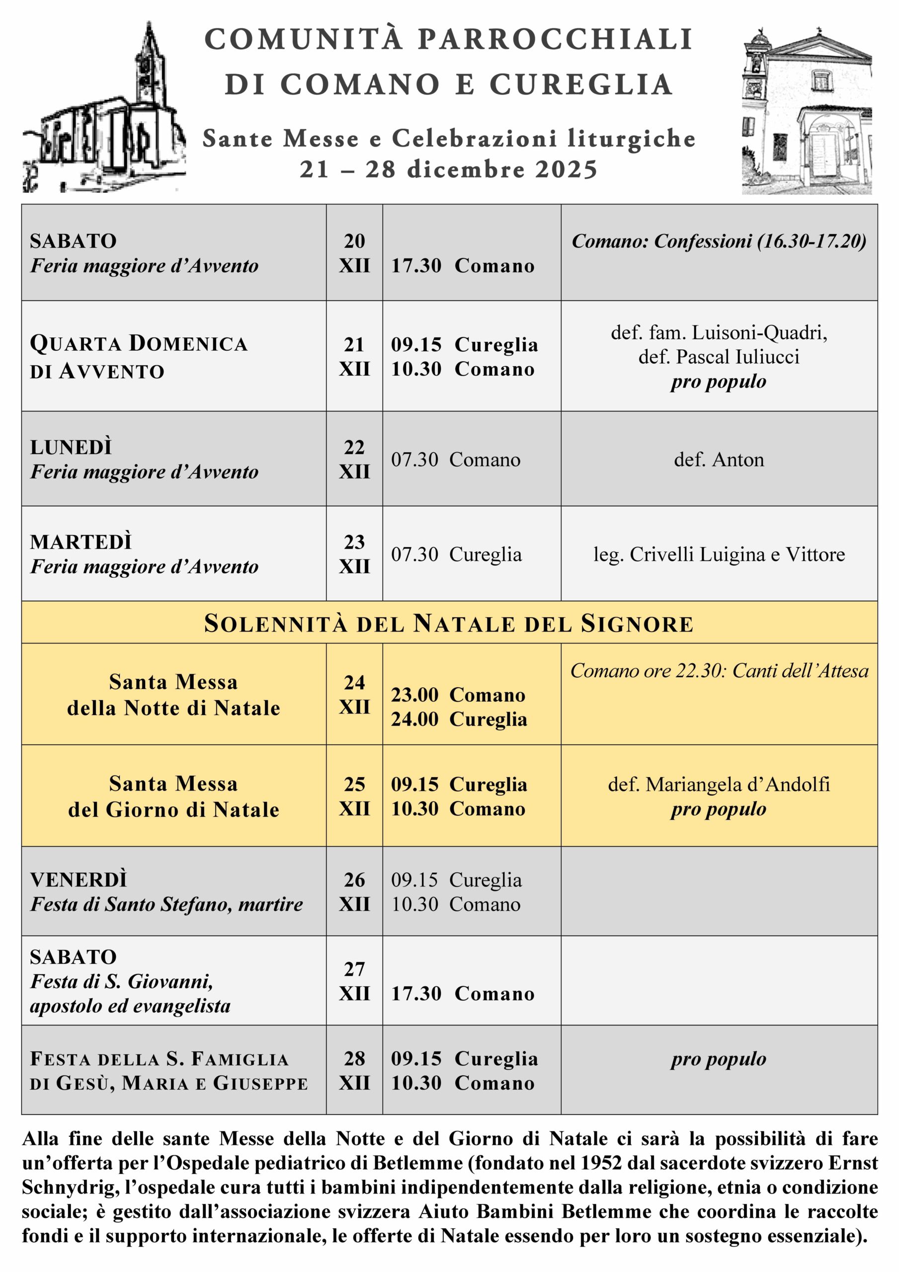 S. Messe e celebrazioni: 21 – 28 dicembre 2025