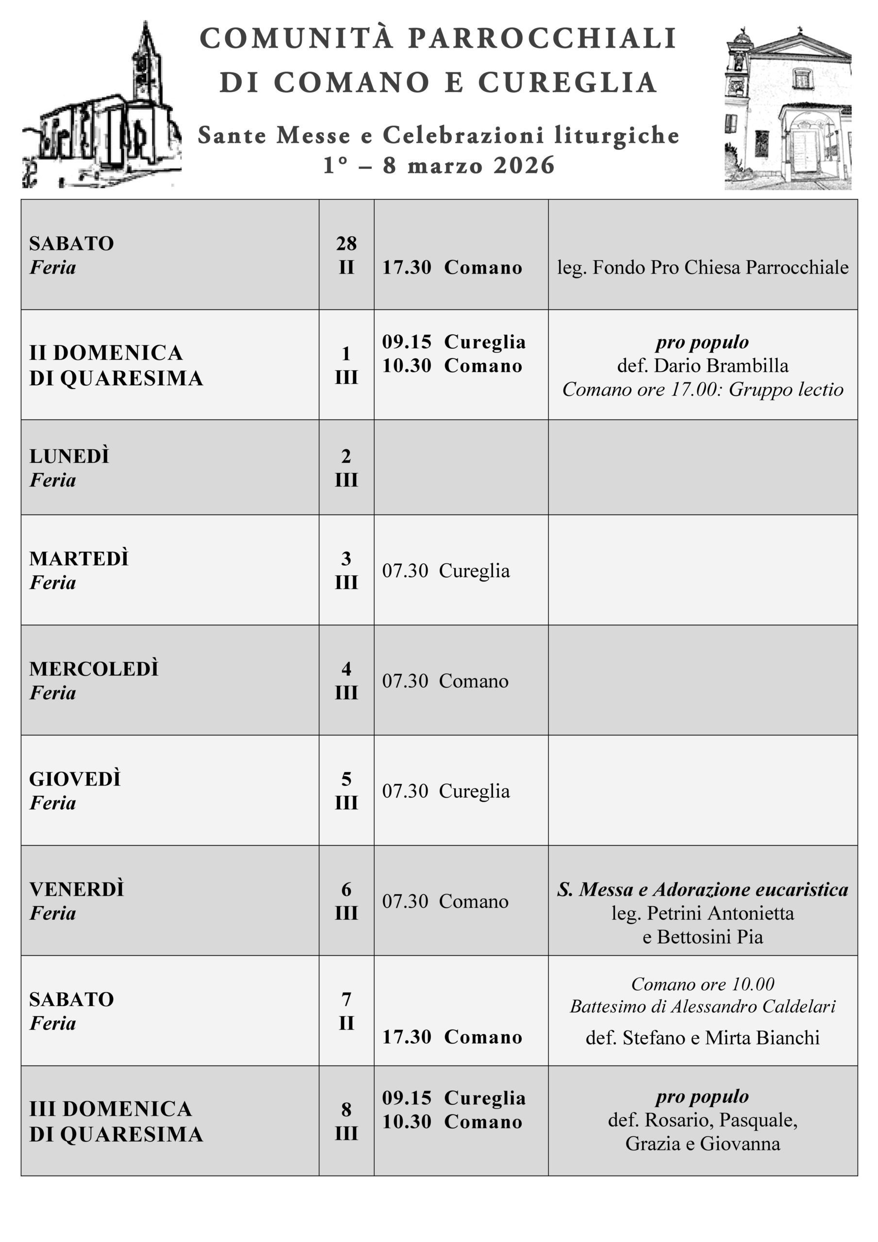 S. Messe e celebrazioni: 1° – 8 marzo 2026 don GiustinoFeb 28, 2026Feb 28, 2026 <span class="nav-subtitle screen-reader-text">Page</span> Previous PostS. Messe e celebrazioni: 22 febbraio – 1° marzo 2026Next PostS. Messe e celebrazioni: 8 – 15 marzo 2026 Related Posts S. Messe e celebrazioni: 12 – 19 aprile 2026 don GiustinoApr 10, 2026Apr 10, 2026 S. Messe e celebrazioni: 5 – 12 aprile 2026 don GiustinoApr 4, 2026Apr 4, 2026 Via Crucis a Comano don GiustinoMar 30, 2026Mar 30, 2026 X