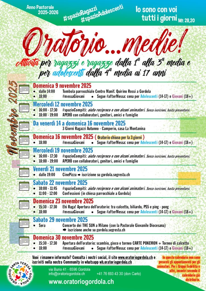 Per avere una “visione d’insieme”, vi proponiamo qui di seguito il manifesto riassuntivo di tutte le attività per i ragazzi e gli adolescenti. Un’occasione per vedere nei giorni interessati se l’oratorio sarà aperto, per un’attività, un gioco, un momento di studio. Logicamente in questo “calendario mensile” non sono presenti i gruppi FedeVita e le formazioni per gli animatori Jr.