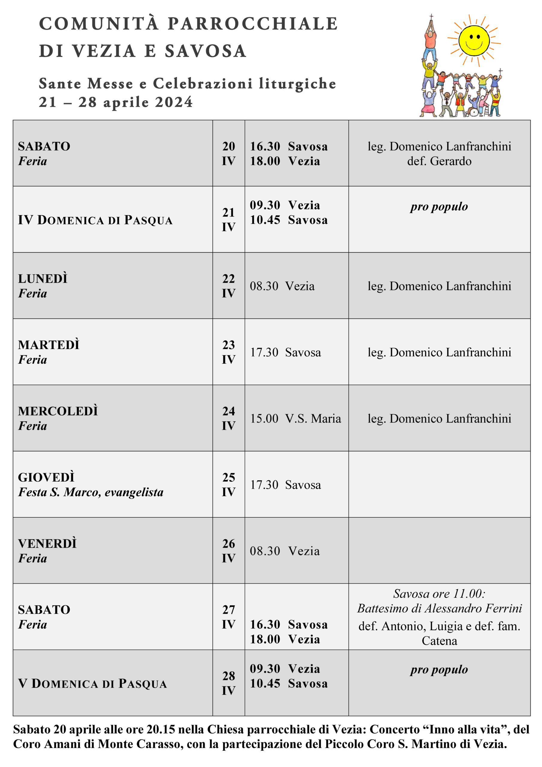 1 min read Celebrazioni S. Messe e celebrazioni: 21 – 28 aprile 2024 21 Aprile 202426 Aprile 2024 don Giustino0