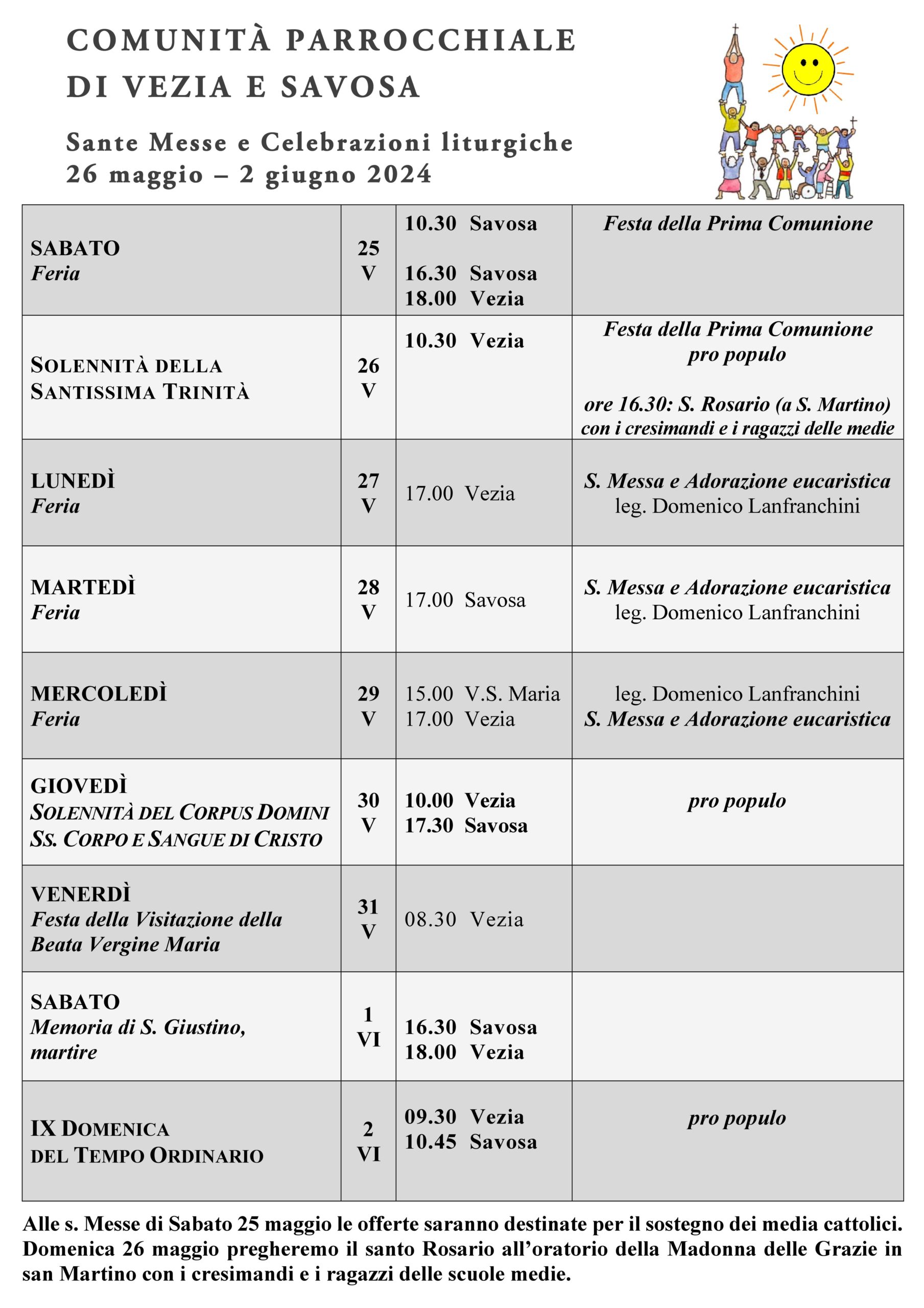 1 min read Celebrazioni S. Messe e celebrazioni: 26 maggio – 2 giugno 2024 23 Maggio 20241 Giugno 2024 don Giustino0