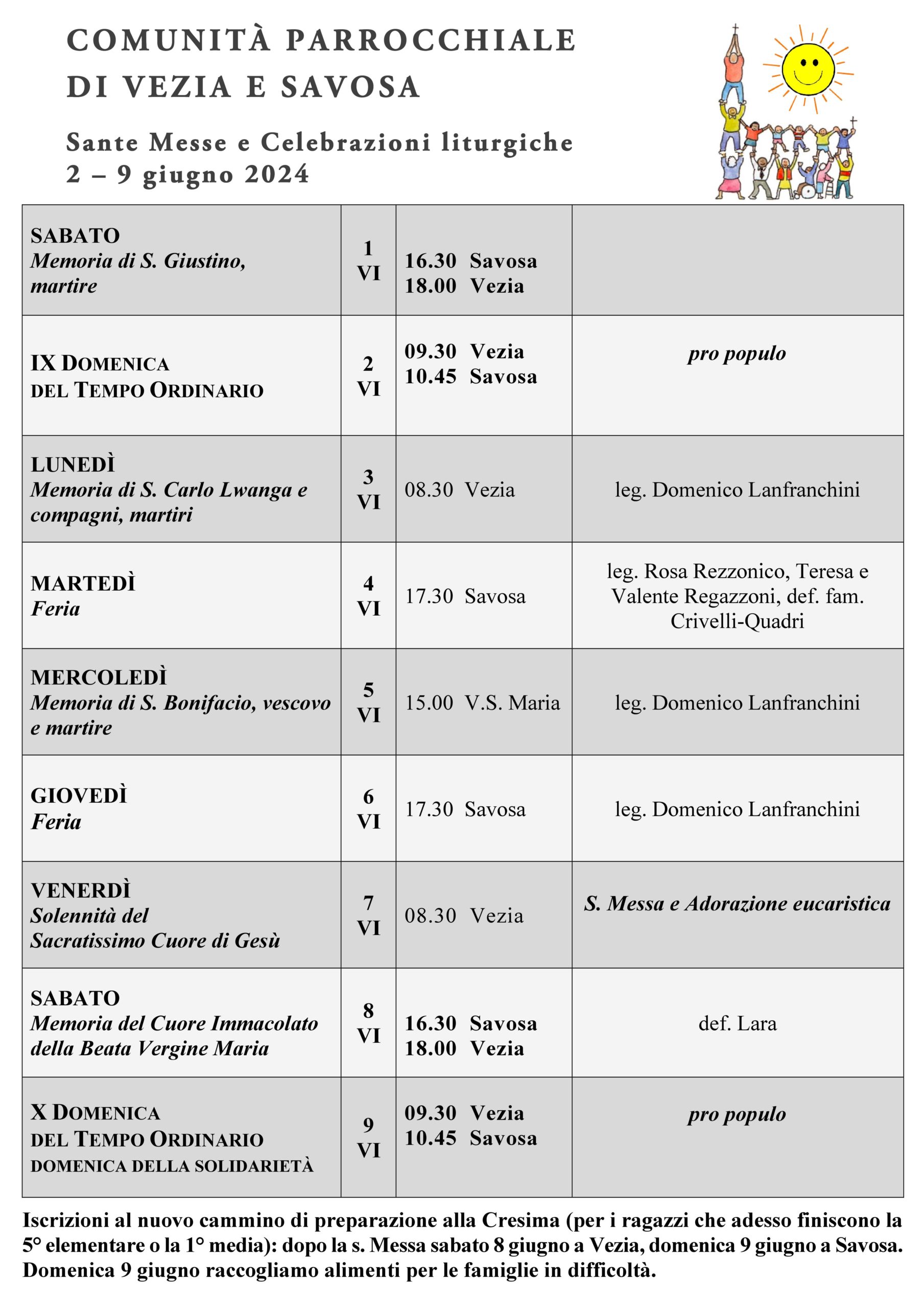 • S. Messe e celebrazioni: 2 – 9 giugno 2024