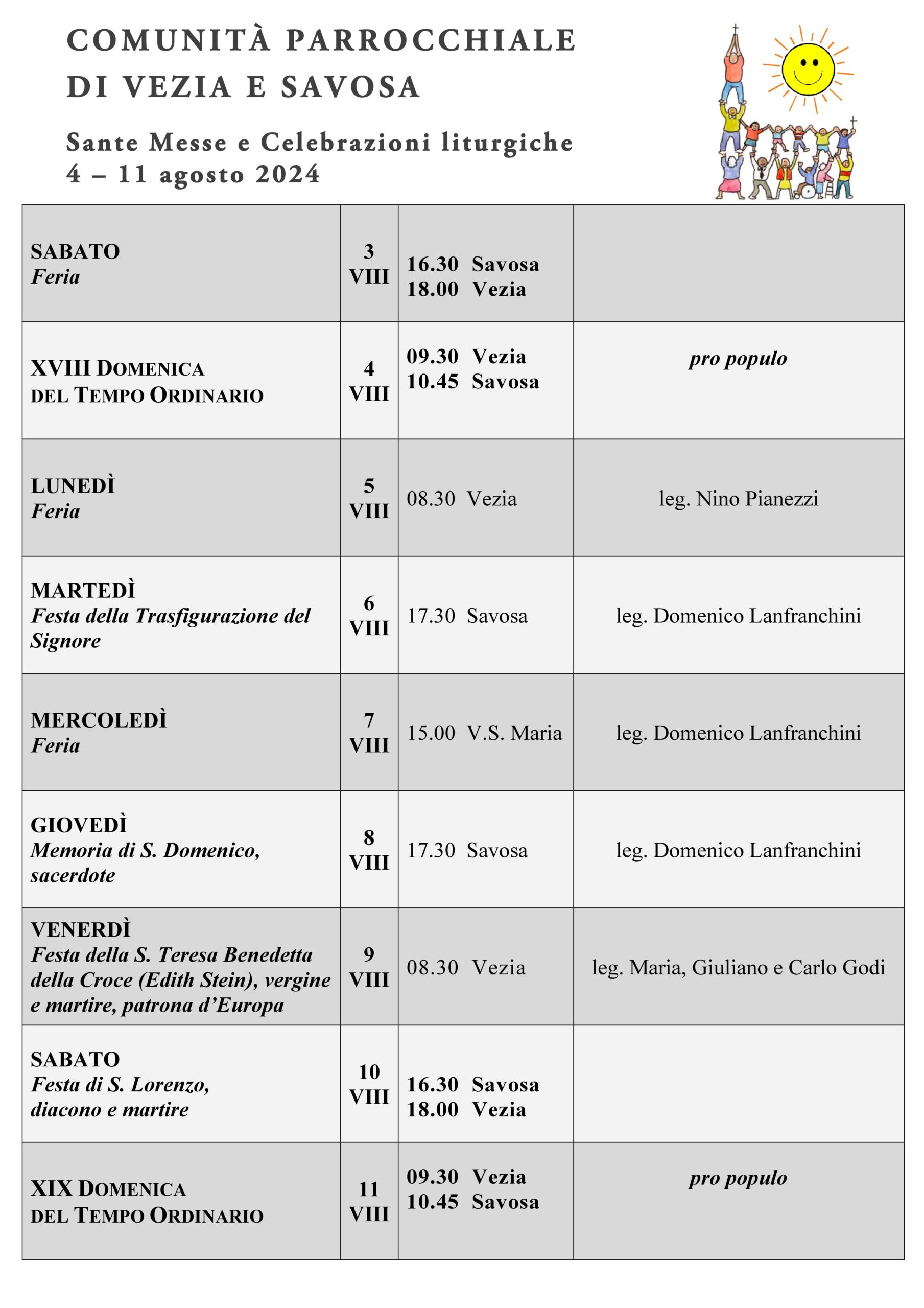 1 min read Celebrazioni S. Messe e celebrazioni: 4 – 11 agosto 2024 7 Agosto 202410 Agosto 2024 don Giustino0