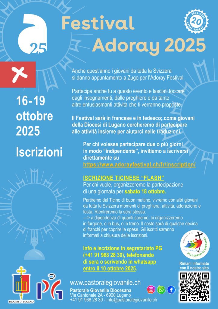 Insieme per i 20 anni di Adoray Festival con altri giovani da tutta la Svizzera. Centinai di Giovani da tutto il Ticino per vivere insieme un momento di amicizia e coinvolgimento tra conferenze, atelier, laboratori, esperienze e preghiera. Non mancare…dal Ticino, possibilità di partecipare al sabato 18 ottobre, oppure iscriviti direttamente sul sito di Adoray.